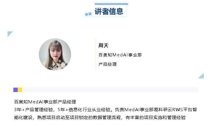 基于此,本次课程特邀百奥知产品经理周天为大家带来《MedAI智能云RWS平台赋能真实世界研究专题分享,期待大家积极参与一同探讨。